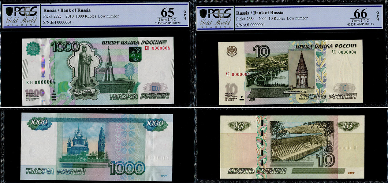 - 10 рублей образца 1997 года, АЯ 0000004, в слабе PCGS Gem UNC 66;