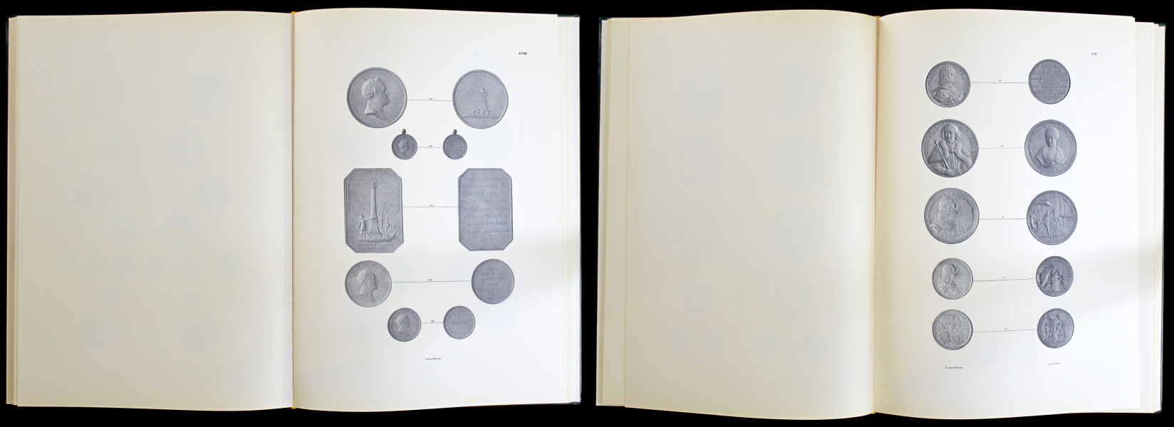В данном конволюте в 2-х томах объединены 5 выпусков, выпущенных в Санкт-Петербурге в 1840-1846 годах Археографической комиссией, созданной в 1834 году при Министерстве народного просвещения для публикации исторических документов. В этом труде описаны и изображены русские медали с XV по XIX столетие и медальоны в память военных событий 1812-15 гг., классифицированные графом Ф.П. Толстым. Всего в издании описано 550 медалей, известных на тот момент. Основой послужили собрания медалей Императорского Эрмитажа, Академии Наук, университетов, а также коллекции члена Археографической комиссии Я.Я. Рейхеля и других частных лиц. Гравирование медалей производилось способом Колласа, усовершенствованного английским художником Бетом.