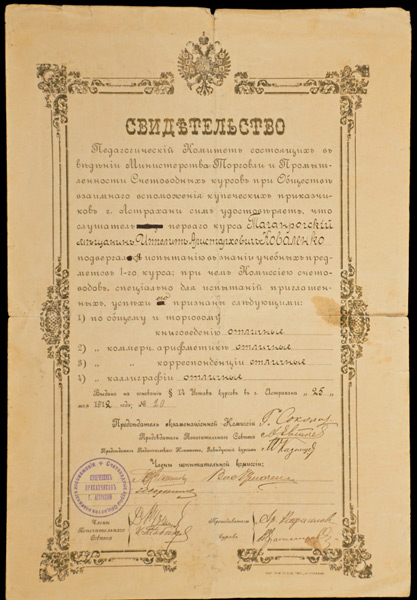 Экзаменационное свидетельство счетоводных курсов г. Астрахани 1912
