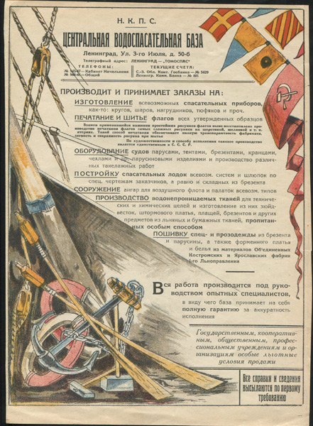 Рекламный вкладыш Н.К.П.С. Центральная водоспасательная база, г. Ленинград. 30-е годы.