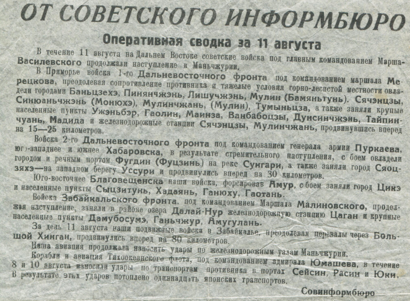 Оперативная сводка Советского Информбюро 11-12 августа 1945