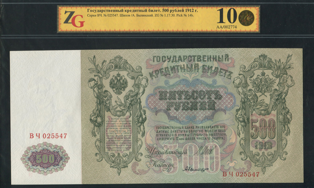 Государственный кредитный билет 500 рублей образца 1912 года, ВЧ 025547. Выпуск Советского правительства. Управляющий Шипов. Кассир Былинский.