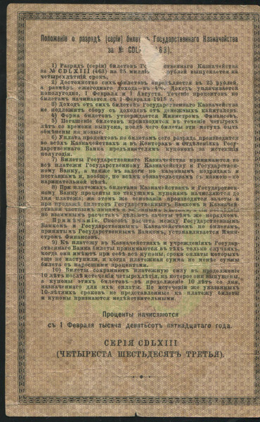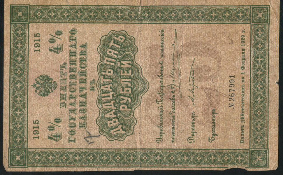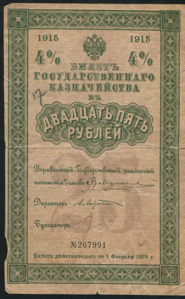4% билет Государственного казначейства 25 рублей 1915 года, №2677991, Серия 463.