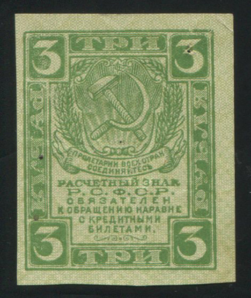 Расчетные знаки РСФСР образца 1920г. выпущены на основание декрета СНК от 26 ноября 1920. Печатались листами по 20 штук в листе. Были в обращении до 1922 г.