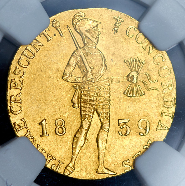 Имитация нидерландского дуката. Чеканена на Санкт-Петербургском монетном дворе. Знак монетного мастера в виде факела.