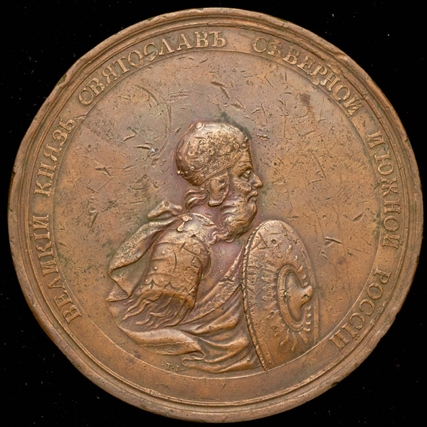 Легенда аверса "ВЕЛИКIИ КНЯЗЬ СВЯТОСЛАВЪ СЕВЕРНОЙ И ЮЖНОЙ РОССIИ". Легенда реверса "ДОСТОИНА МНОГИХЪ ЦАРСТВЪ".