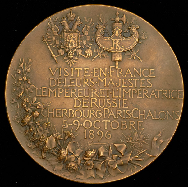 На реверсе под гербами России и Франции надпись в 7 строк "VISITE • EN • FRANCE | DE • LEURS • MAJESTÉS | L ‘ EMPEREUR • ЕТ • L ‘ IMPÉRATRICE | DE • RUSSIE | CHERBOURG • PARIS • CHALONS | 5-9 • OCTOBRE | 1896". Внизу цветочная гирлянда.