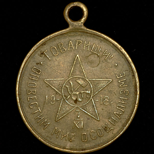 Жетон "В память 1-й годовщины Великой Октябрьской Социалистической революции. Товарищи, оповестим мир о социализме 7/XI 1918 г."
