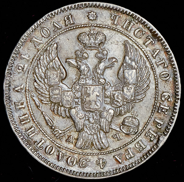 Уздеников 1604. Биткин 195. Орел 1841 года, 9 перьев в хвосте. 8 звеньев в венке. Лаковое покрытие.