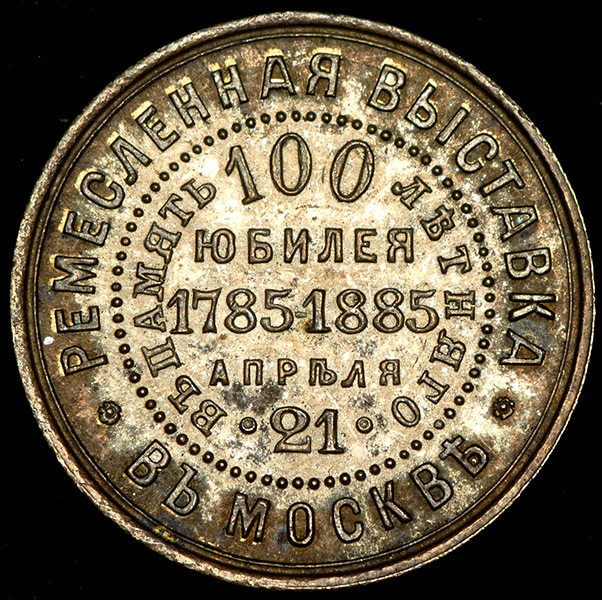 Жетон "В память 100-летия Ремесленной выставки в Москве 1785 г." 1885