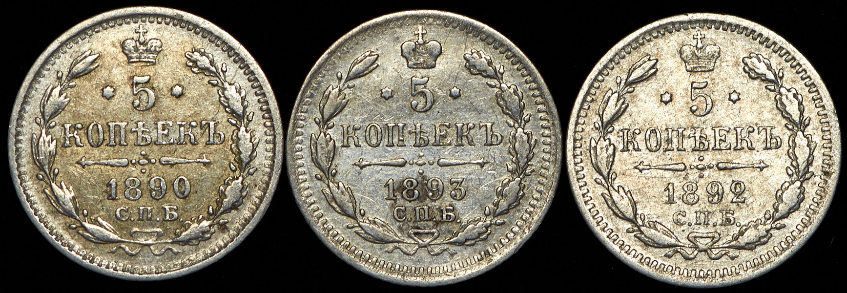 Набор из 3-х сер. монет 5 копеек 1890-93