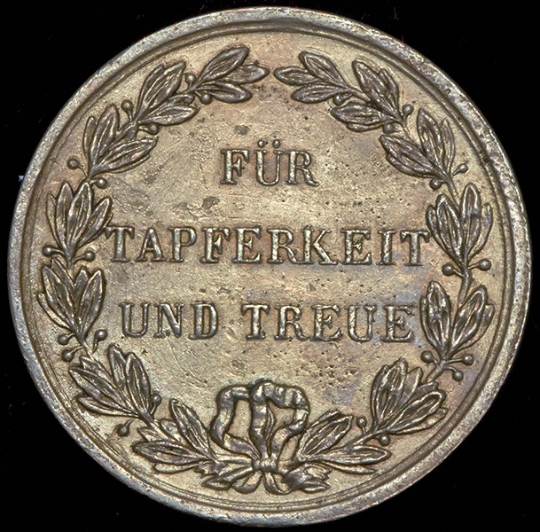 На реверсе в лавровом венке надпись "FÜR TAPFERKEIT UND TREUE" (для храбрости и верноподданности).
