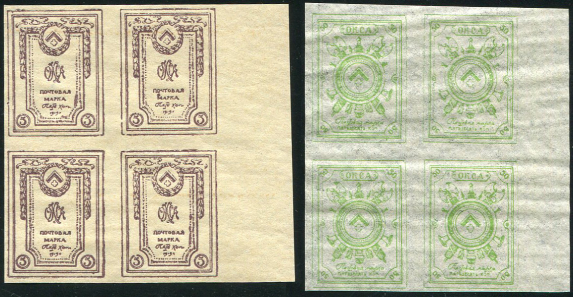 Отдельный Корпус Северной Армии. Генерал-майор А.П. Родзянко. Комлпект марок в квардблоках: 5, 10, 15, 20 и 50 копеек. В великолепной сохранности.