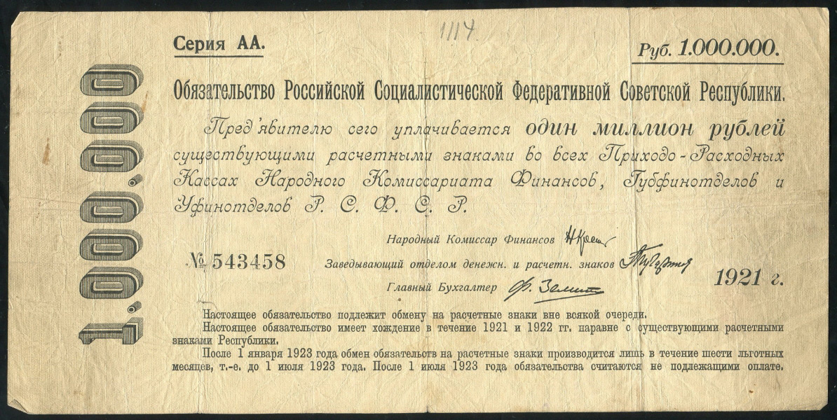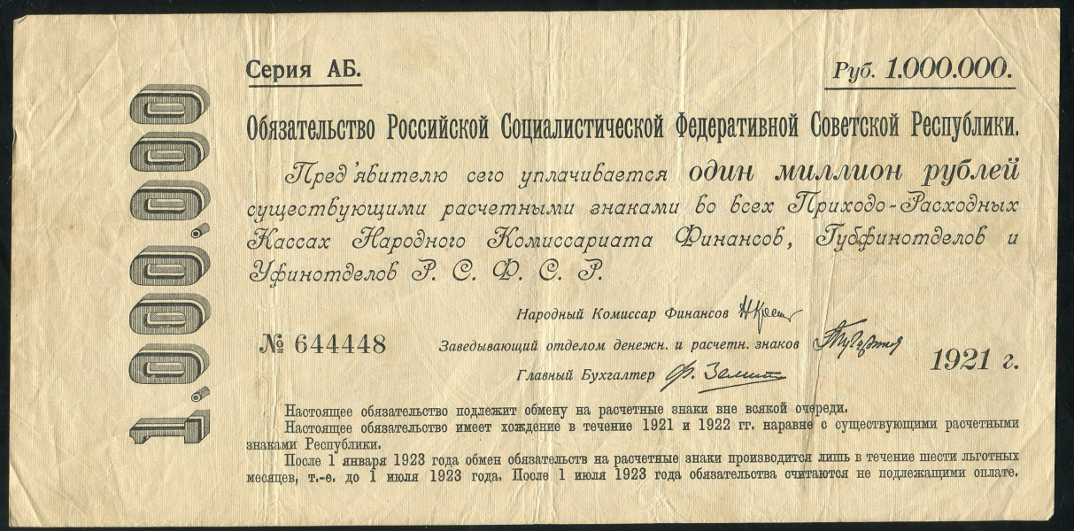 Комплект из двух обязательств РСФСР 1000000 рублей 1921 года: клише №1 и №2.