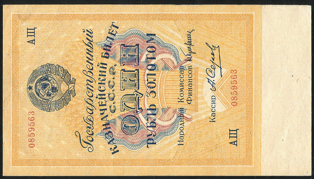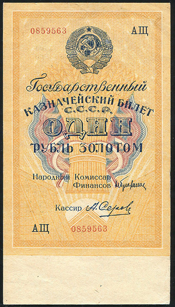 Государственный казначейский билет 1 рубль золотом 1928 образца 1924 года, АЩ 0859563. Нарком Н.П. Брюханов, кассир А. Серов.