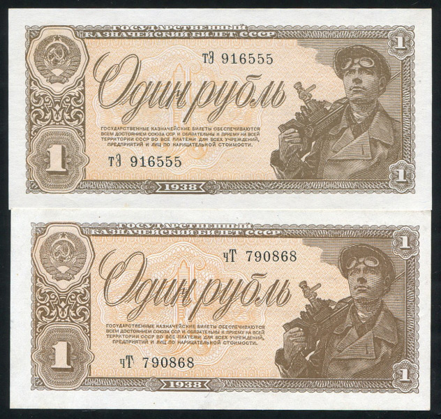 В набор вошли два государственный казначейских билета СССР 1 рубль образца 1938 года.