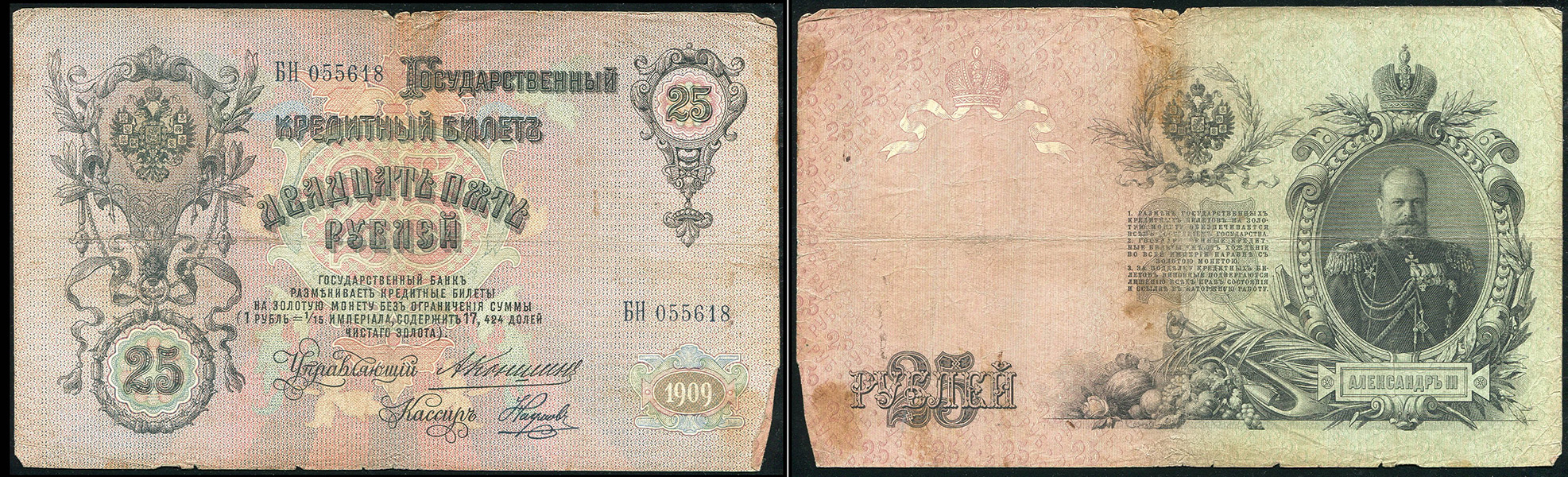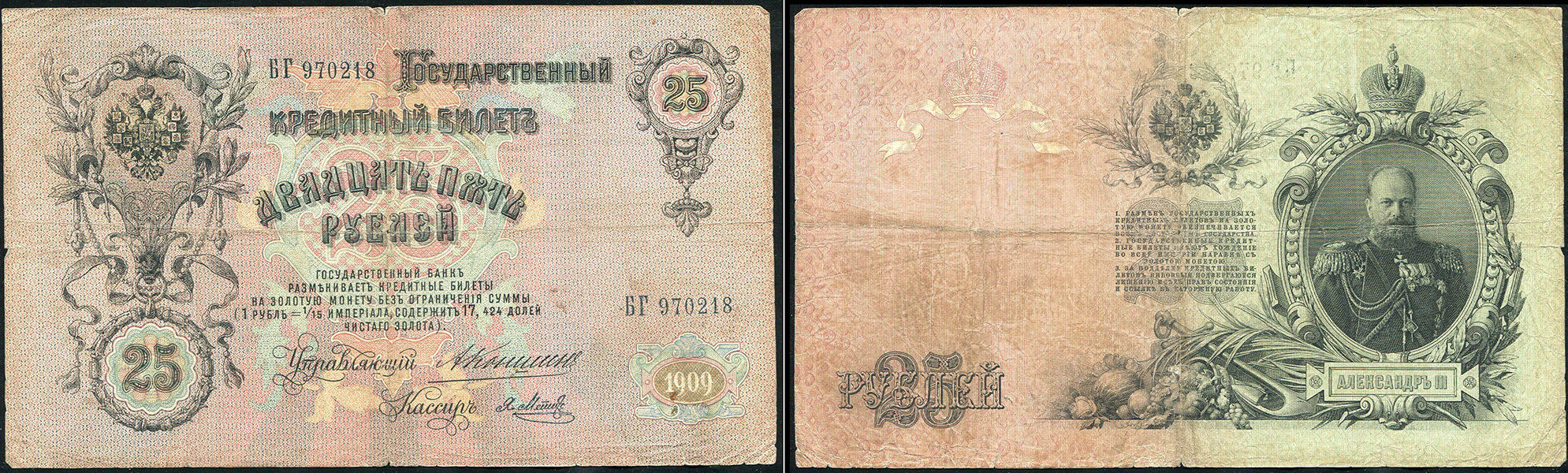 Набор из 3-х государственных кредитных билетов 25 рублей образца 1909 года. Управляющий Коншин.