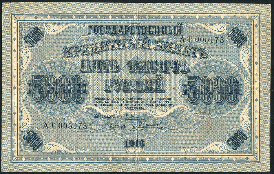 Государственный кредитный билет 5000 рублей 1918 года, АТ 005173. Кассир Гаврилов. В/з горизонтальный.