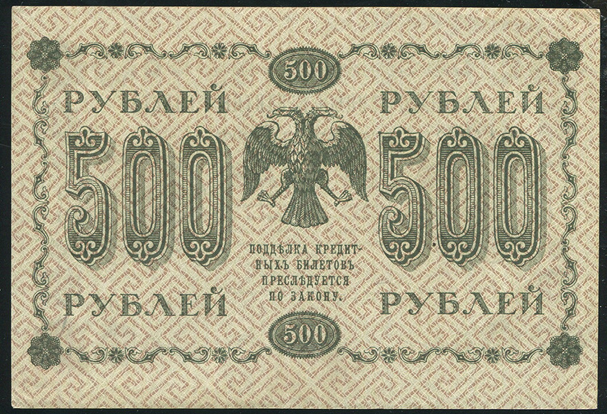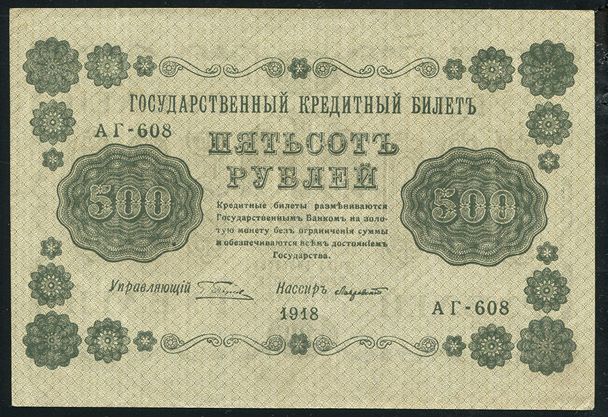 Государственный кредитный билет 500 рублей 1918 года, АГ-608. Кассир Лавровский. Уральская фабрика Гознака.