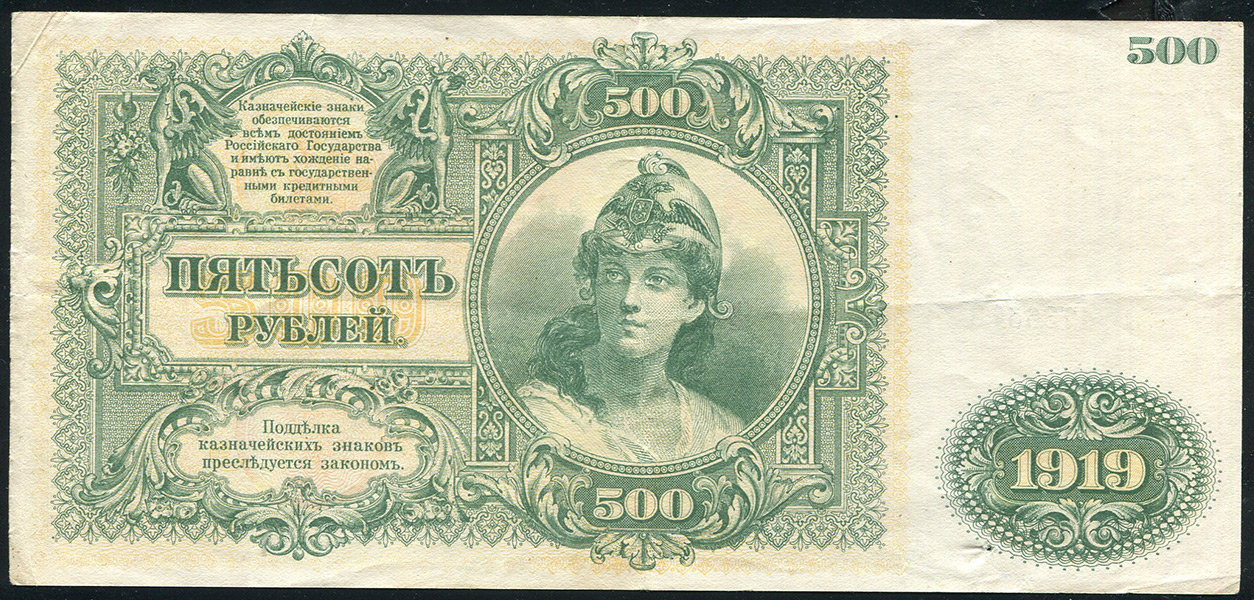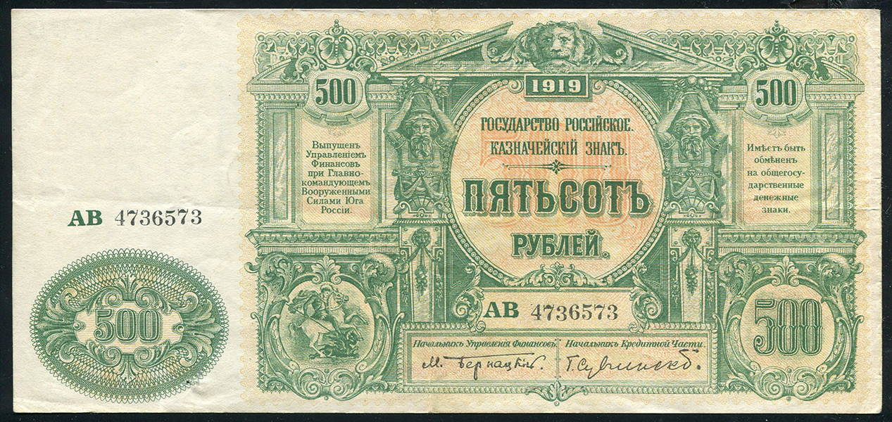 Государство Российское. Управление финансов при главнокомандующем Вооруженными силами на Юге России. Казначейский знак 500 рублей образца 1919 года, АВ 4736573. Подписи Бернацкий, Сувчинский. Цвет литер серии зеленый.