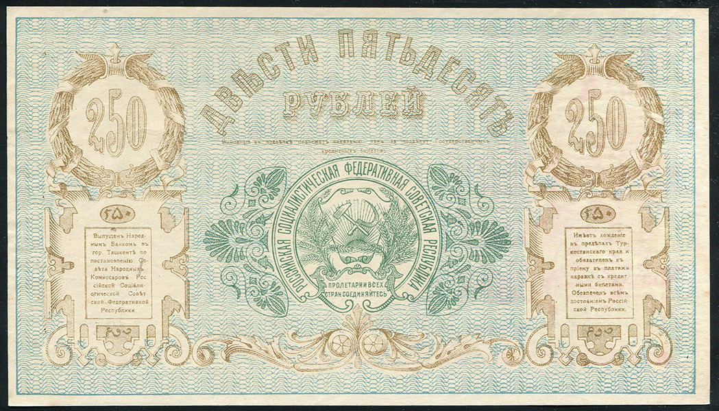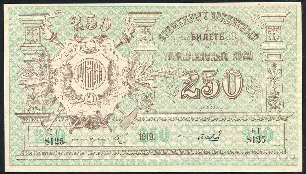 Народный банк в г. Ташкент, временный кредитный билет Туркестанского края образца 1919 года, БГ 8125. Кассир Шевелев. В/з номинала - цифры "50". Редка в подобной сохранности.