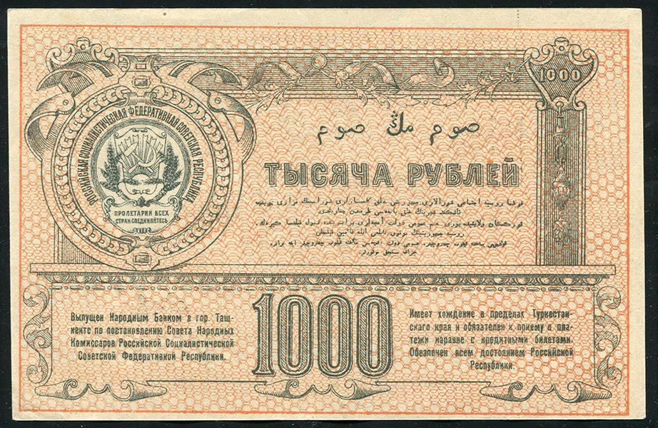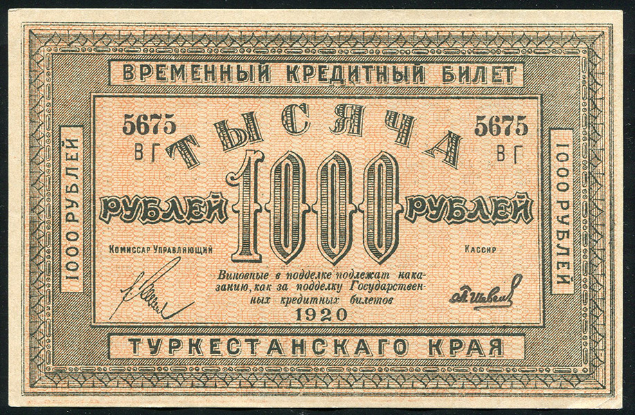 Народный банк в г. Ташкент, временный кредитный билет Туркестанского края 1000 рублей образца 1920 года, ВГ 5675. Кассир Шевелев. В/з светлые тонкие звезды.