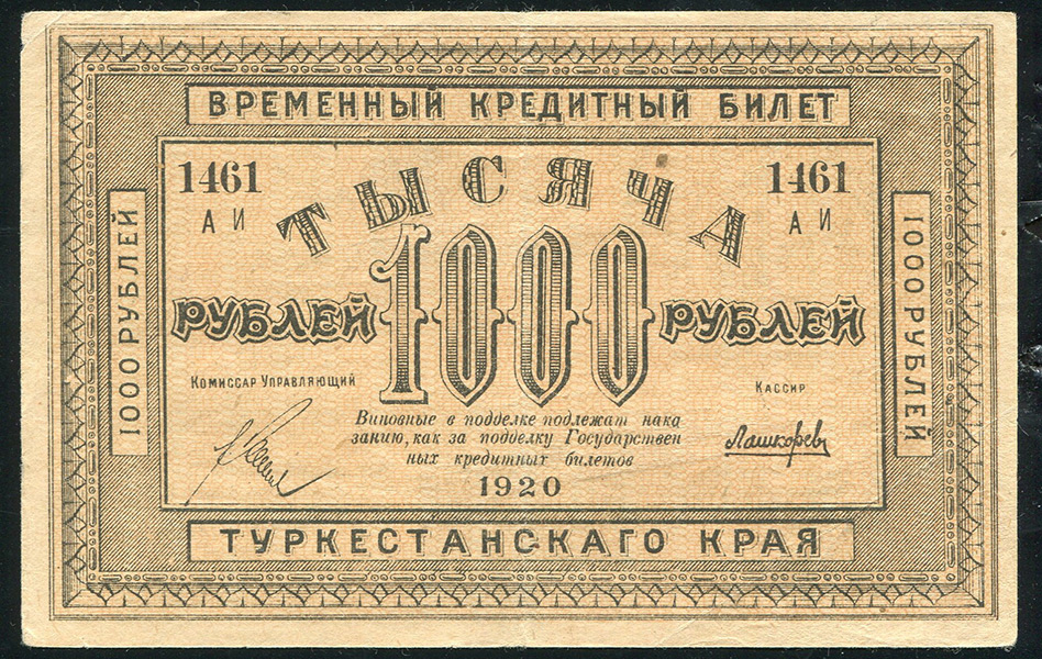 Народный банк в г. Ташкент, временный кредитный билет Туркестанского края 1000 рублей образца 1920 года, АИ 1461. Кассир Лашкарев. Без в/з.