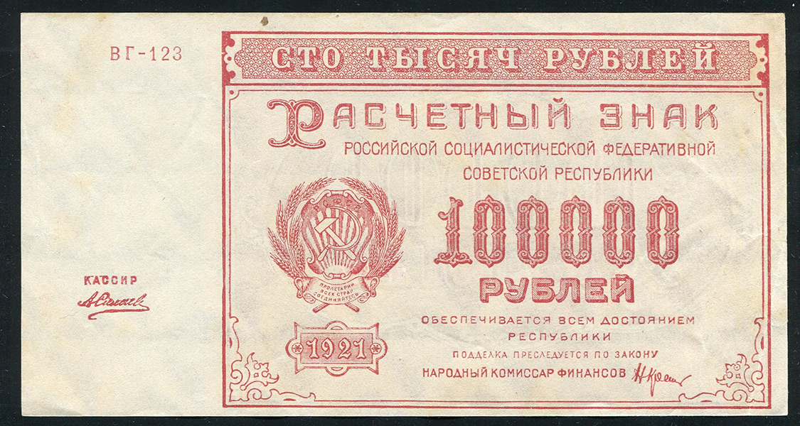 Расчетный знак РСФСР образца 1921 года 100000 рублей, ВГ-123. Кассир Силаев.