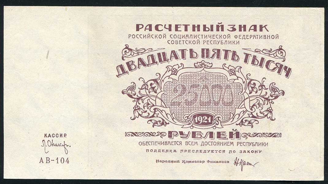 Расчетный знак РСФСР образца 1921 года 25000 рублей, АВ-104. Кассир Оников.