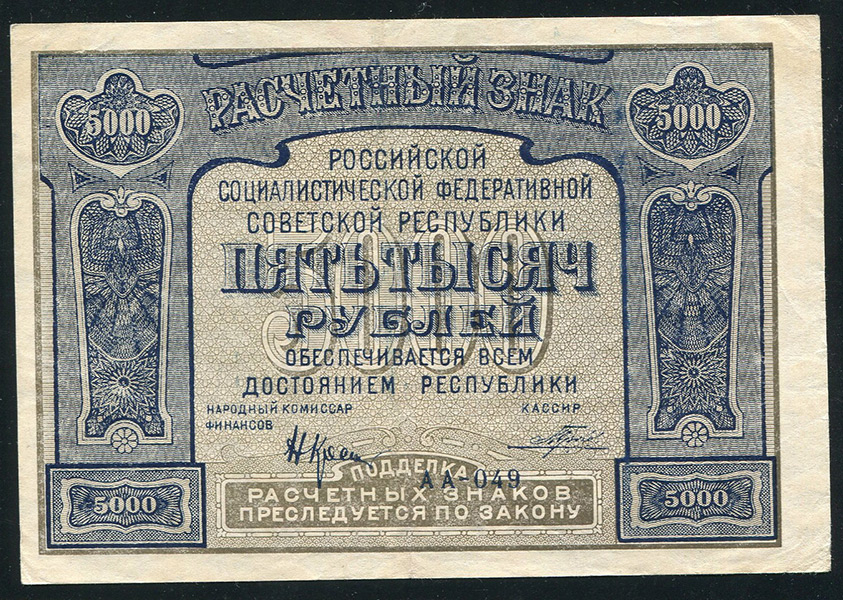 Расчетный знак РСФСР образца 1921 года 5000 рублей, АА-049. Кассир Порохов.