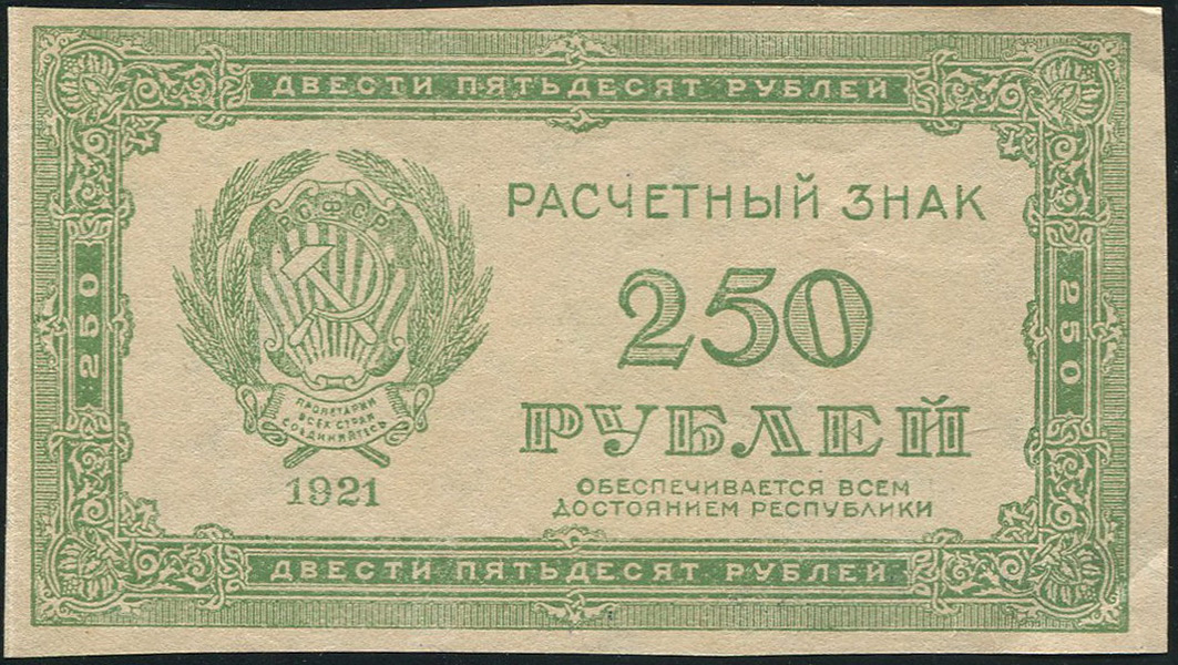 Расчетный знак РСФСР образца 1921 года 250 рублей. В/з цифры "250".