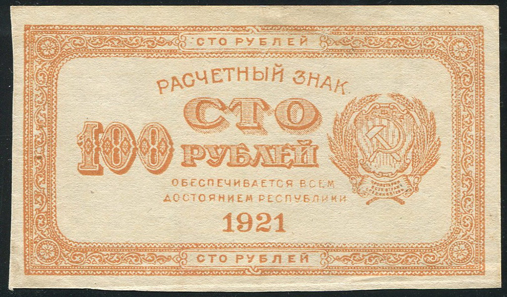 Расчетный знак РСФСР образца 1921 года 100 рублей. Оранжевый. В/з цифры 100.