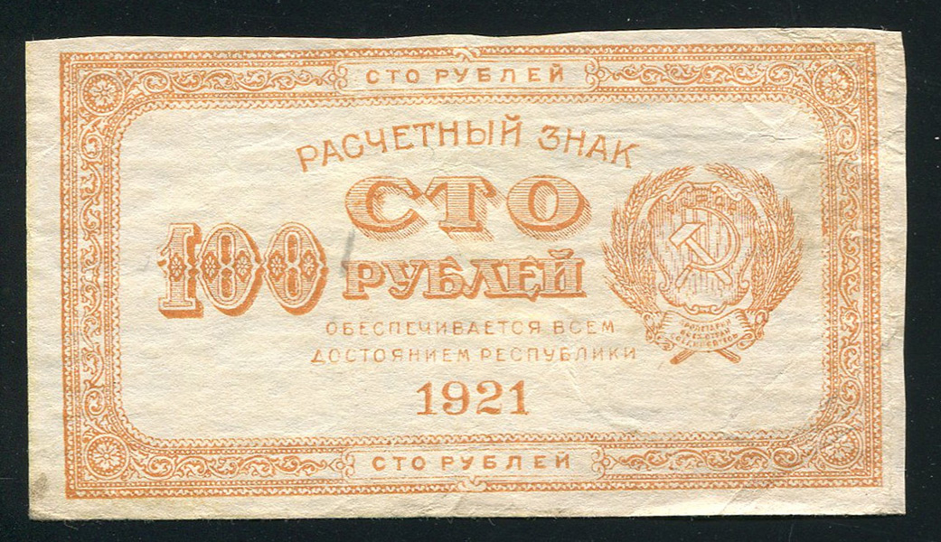 Расчетный знак РСФСР образца 1921 года 100 рублей. Оранжевый цвет. В/з цифры 100.