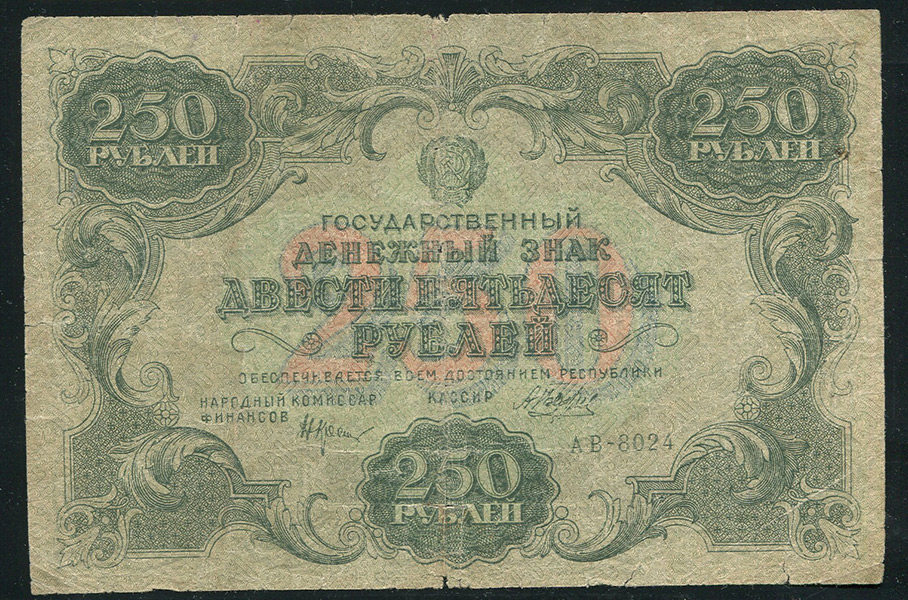 Государственный денежный знак РСФСР 250 рублей образца 1922 года, АВ-8024. Кассир Беляев.