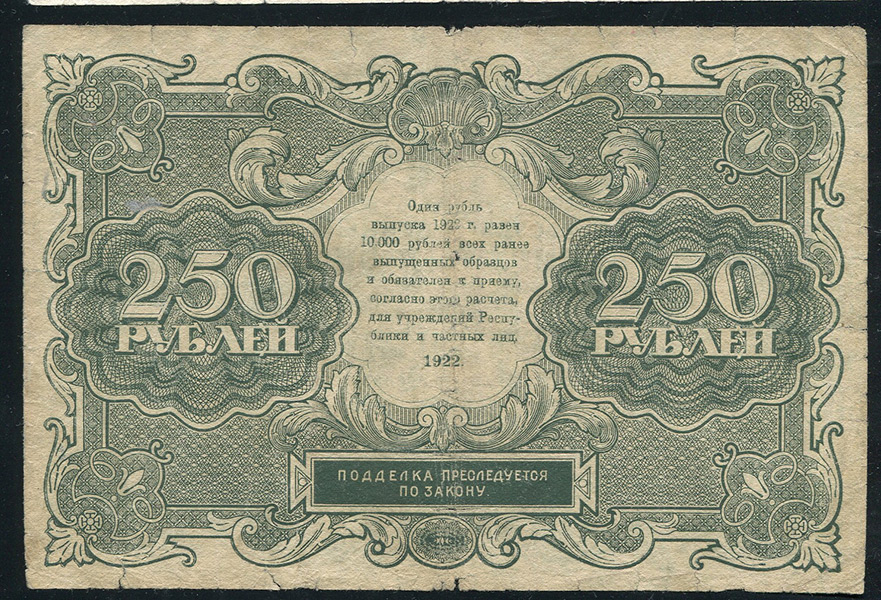 Текст на обратной стороне "Один рубль выпуска 1922 г. равен 10.000 рублей всех ранее выпущенных образцов и обязателен к приему, согласно этого расчета, для учреждений Республики и частных лиц."