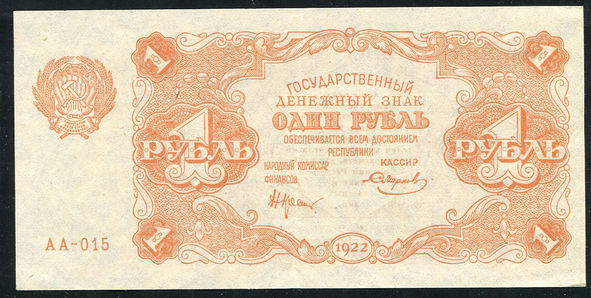 Первая деноминация. Государственные денежные знаки образца 1922 г. выпущены на основание декрета СНК от 3 ноября 1921. 1 рубль 1922 приравнивался к 10000 рублей всех прежних выпусков. В обращении были до 1 октября 1923 г.