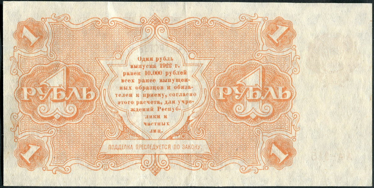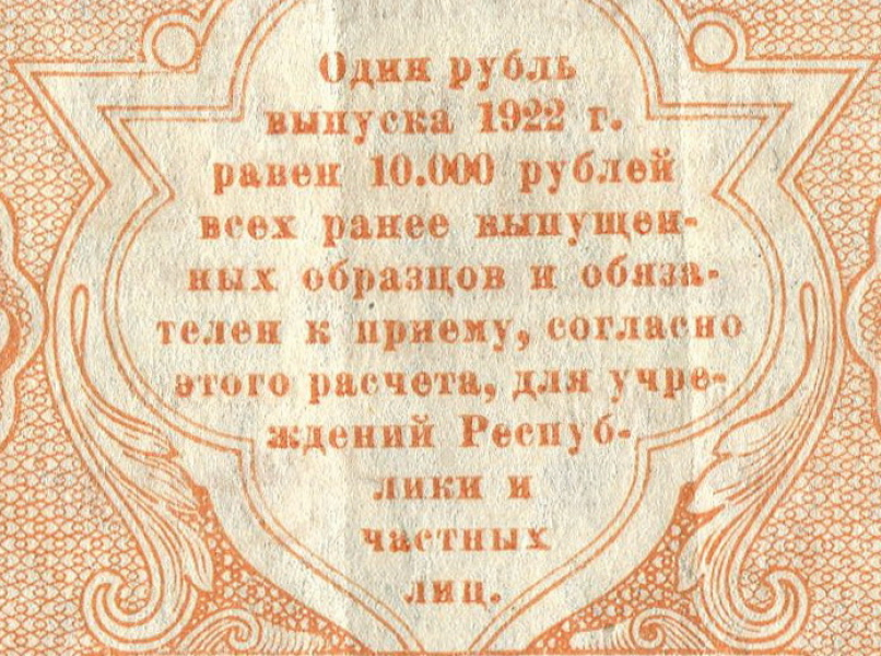 Текст на обратной стороне "Один рубль выпуска 1922 г. равен 10.000 рублей всех ранее выпущенных образцов и обязателен к приему, согласно этого расчета, для учреждений Республики и частных лиц."
