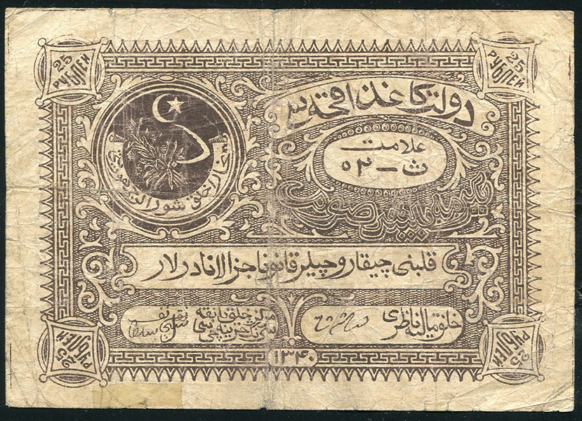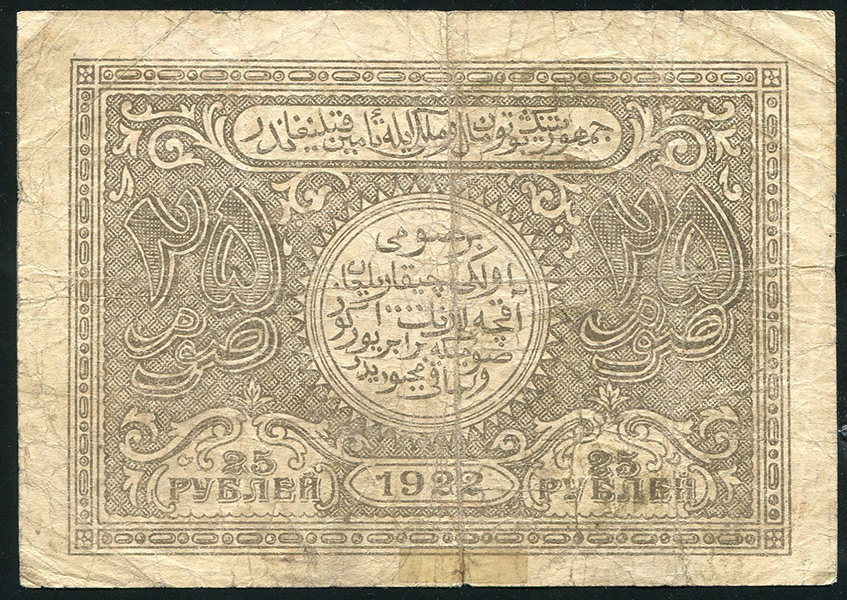 Бухарская Народная Советская республика 25 рублей 1922 года. Выпуск после деноминации: 1 новый рубль равен прежним 10000 рублям. Бумага белая. В/з "50".