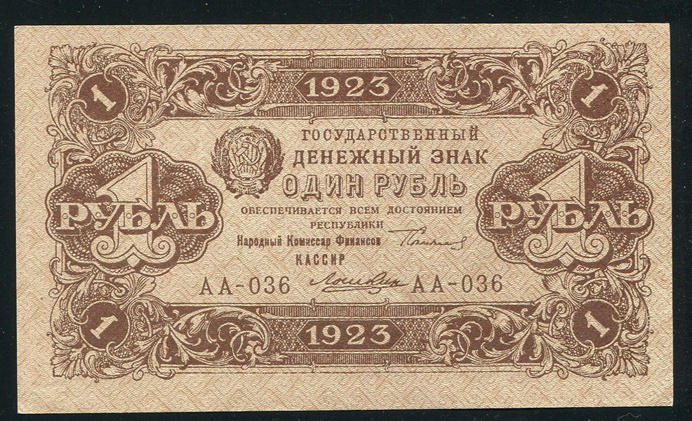 Государственный денежный знак РСФСР 1 рубль образца 1923 года, АА-036. Кассир Лошкин.