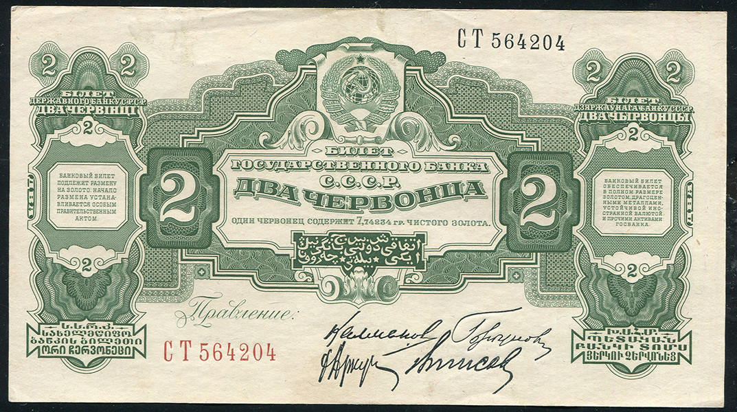 Билет Государственного Банка СССР 2 червонца образца 1928 года, СТ 564204. Подписи правления: М.И. Калманович, Горбунов, Г.М. Аркус, Ванисов.