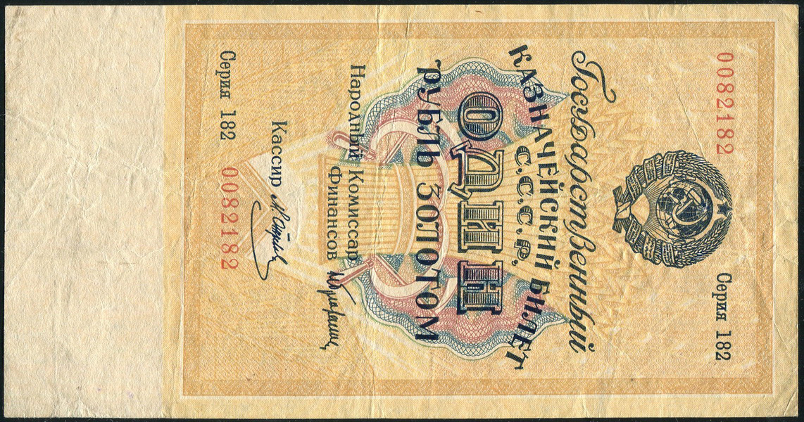 Государственный казначейский билет СССР 1 рубль образца 1928 года, серия 182, 0082182. С "СЕРИЯ". С упрощенной нумерацией. Кассир Отрезов.