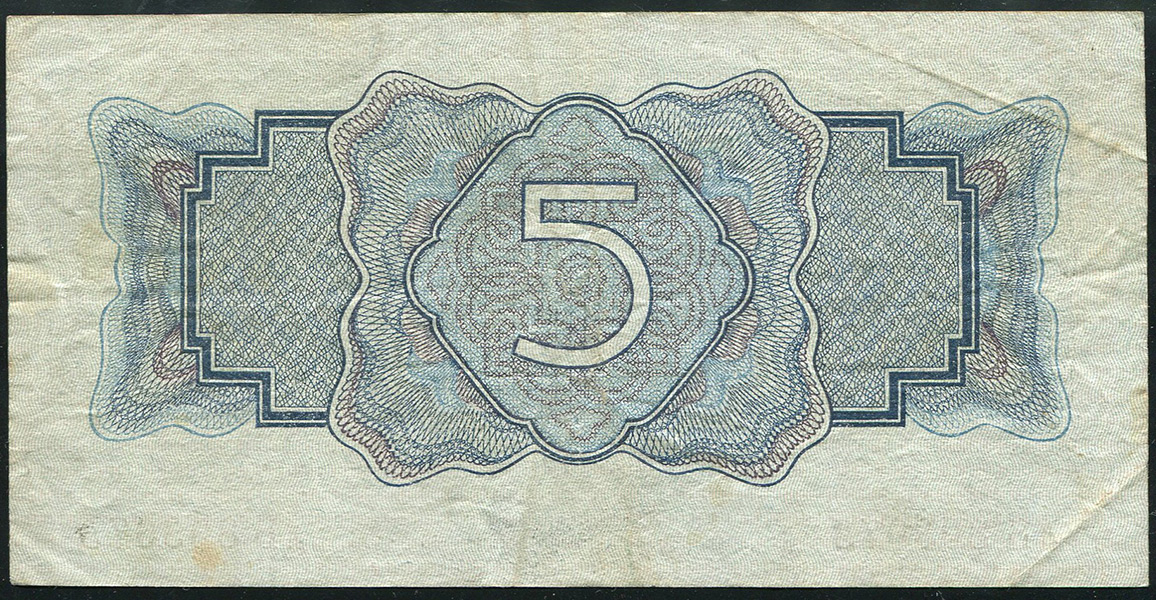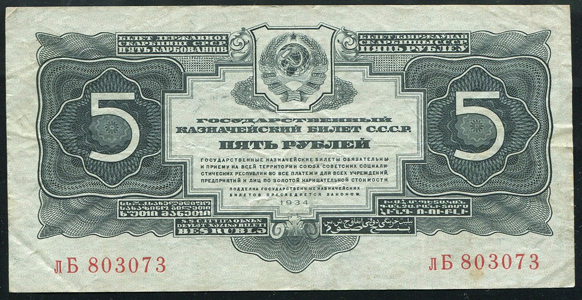 Государственный казначейский билет СССР 5 рублей образца 1934 г., лБ 803073. Второй выпуск - без подписи наркома финансов.