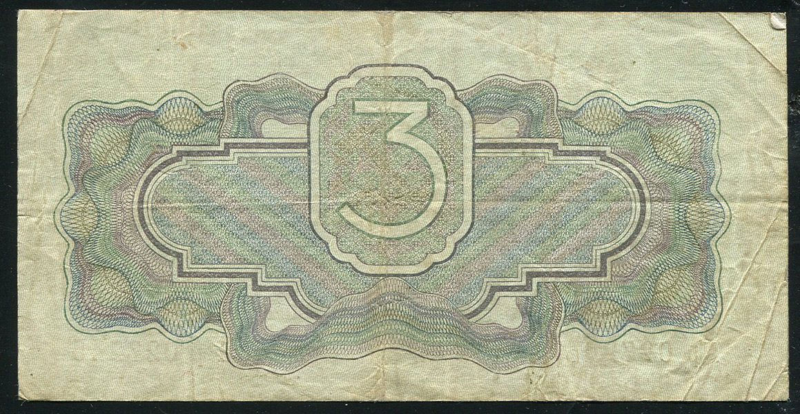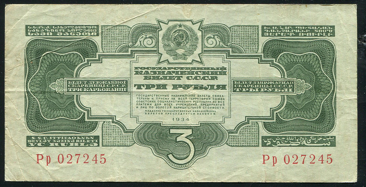 Государственный казначейский билет СССР 3 рубля образца 1934 г., Рр 027245. Второй выпуск - без подписи наркома финансов.