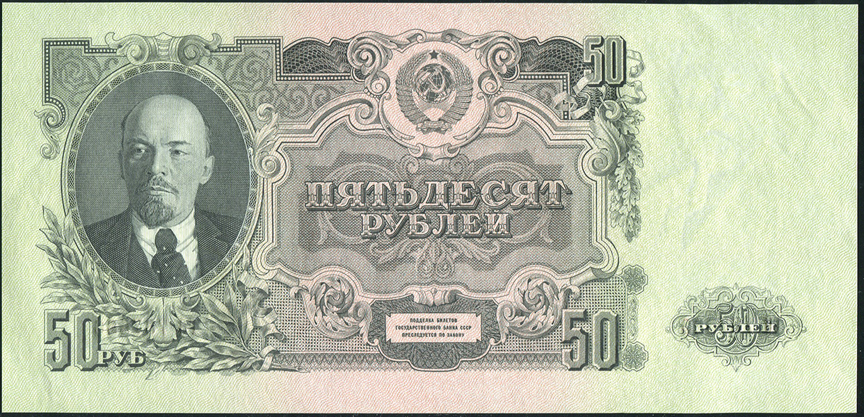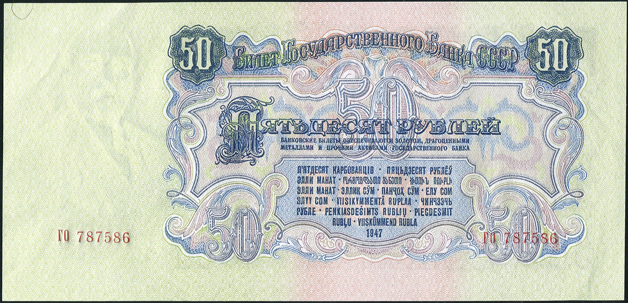 Билет Государственного Банка СССР 50 рублей образца 1947 года, ГО 787586. Тип 1947 года - 16 лент в гербе.