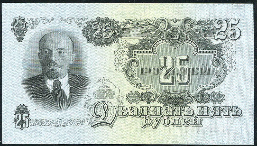Билет Государственного Банка СССР 25 рублей образца 1947 года, Нэ 864054. Тип 1947 года - 16 лент в гербе.