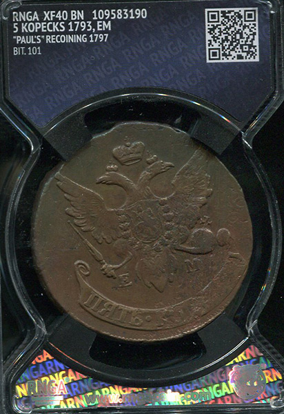 5 копеек 1793 "Павловский перечекан" (в слабе) ЕМ