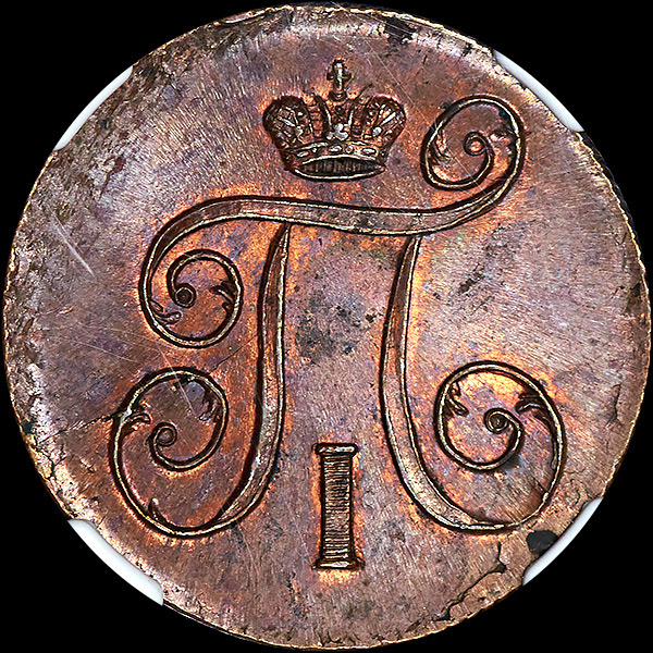 Превосходный коллекционный экземпляр. Яркий переливающийся штемпельный блеск. Четкий рельеф. Золотисто-красный отблеск патины вокруг контуров рельефа. Редка в столь высокой степени сохранности.