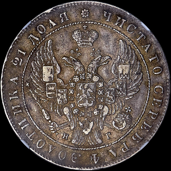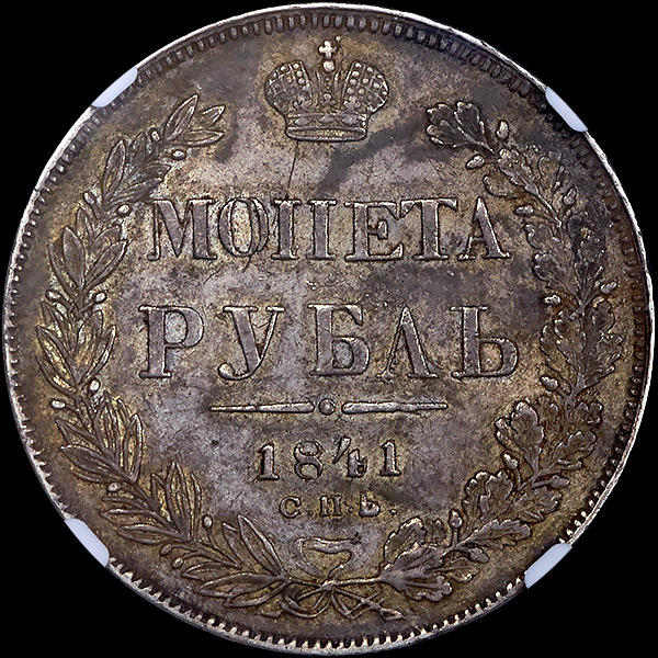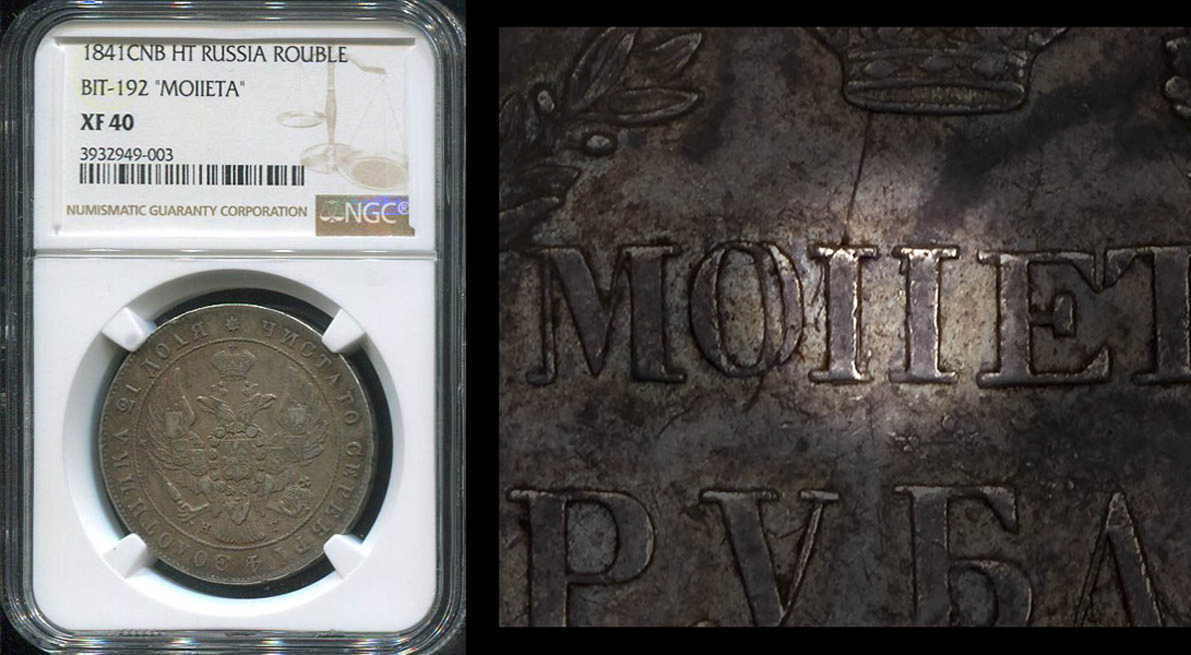 Без горизонтальных гаст в букве Н в слове "МОНЕТА", в цифре 4 в дате, в букве Б в обозначении монетного двора "СПБ".