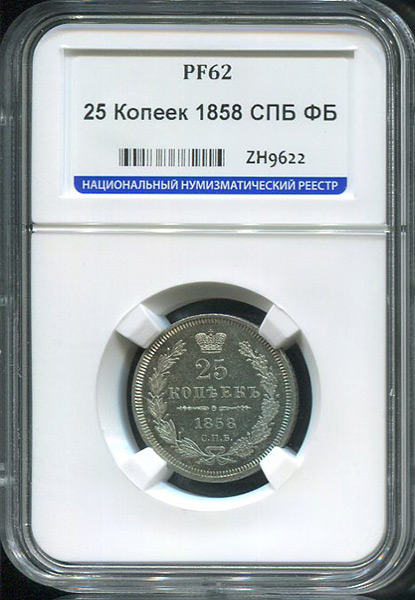 25 копеек 1858 (в слабе) СПБ-ФБ