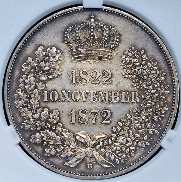 Амалия Августа Баварская (1801–1877) 21 ноября 1822 года в Дрездене Амалия Августа вышла замуж за принца Саксонии Иоганна. В 1872 году в юбилей свадьбы был отчеканен двойной талер.